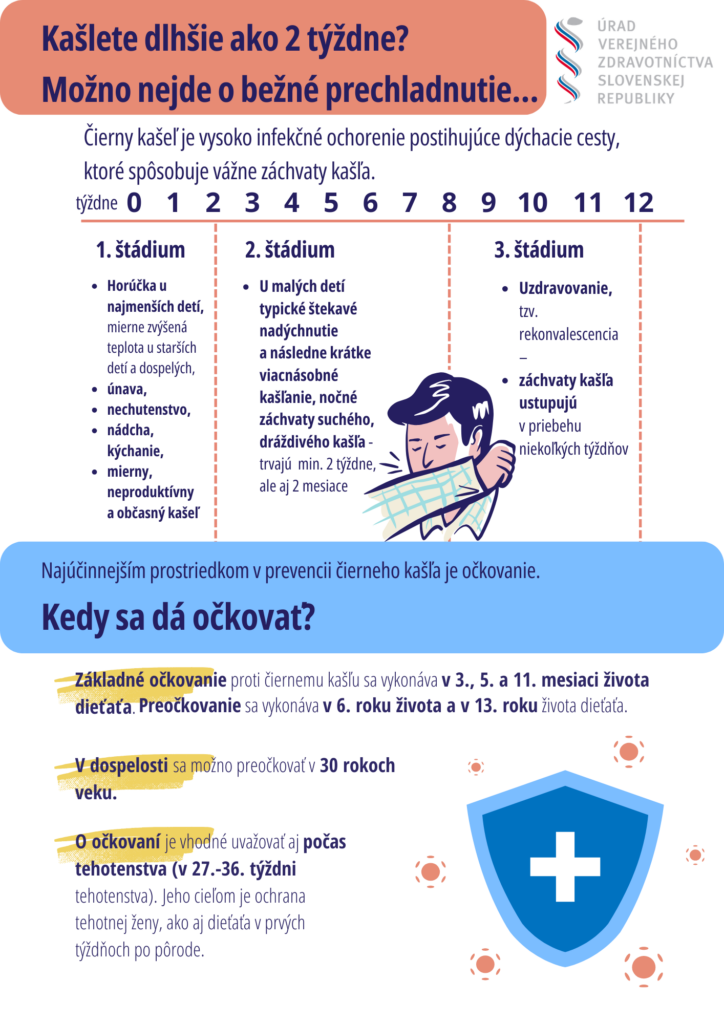 Čierny kašeľ (pertussis) je vysoko infekčné ochorenie dýchacích ciest, ktoré sa spočiatku môže prejavovať ako bežné prechladnutie. Práve preto býva často podcenený – no pri pretrvávajúcom kašli, najmä dlhšom ako dva týždne, je dôležité spozornieť. Ochorenie môže mať ťažší priebeh najmä u malých detí, ale nevyhýba sa ani dospelým.