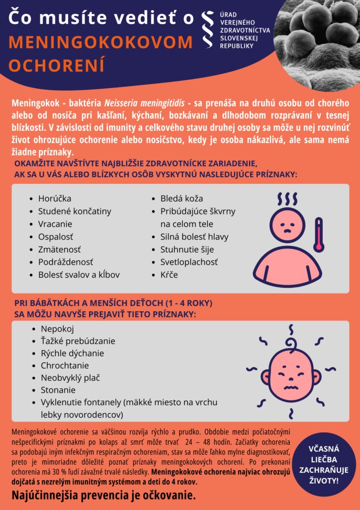 Príznaky sa môžu spočiatku podobať bežným ochoreniam, no stav sa môže rýchlo zhoršiť. Preto je dôležité vedieť ich rozpoznať a v prípade podozrenia okamžite vyhľadať lekársku pomoc. Najúčinnejšou ochranou je prevencia – najmä očkovanie, ktoré výrazne znižuje riziko vzniku ochorenia.